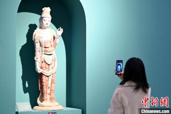 圖為3月3日,市民參觀莫高窟彩塑臨摹品! 中新社記者 九美旦增 攝