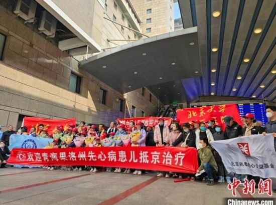 3月19日,來自青海省果洛藏族自治州的17名先天性心臟病患兒在家屬等人陪同下,乘坐火車抵達北京西站,將在北京的四家醫(yī)院接受免費手術(shù)治療。圖為接站現(xiàn)場。中新社發(fā) “同心·共鑄中國心”組委會供圖