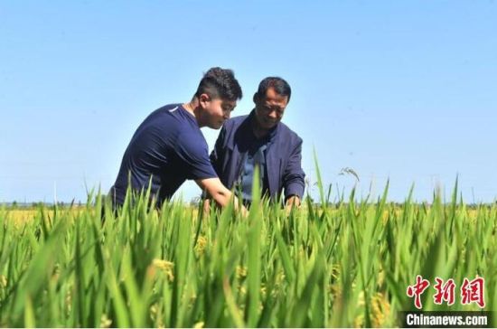 金秋時(shí)節(jié),臺(tái)胞林駿睿(左)與吉林農(nóng)民楊萬芳在稻田里觀察水稻。 高龍安 攝