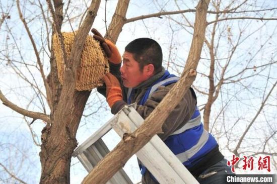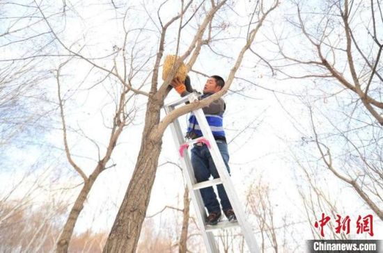 11月23日,趁著雪后天晴,吉林長春友誼公園的工作人員忙著維護樹上的草編鳥巢,并投放了鳥糧。該公園生態(tài)環(huán)境好、野生鳥類多,園方已經(jīng)連續(xù)三年在園區(qū)設置百余個草編鳥巢助鳥類安全過冬。