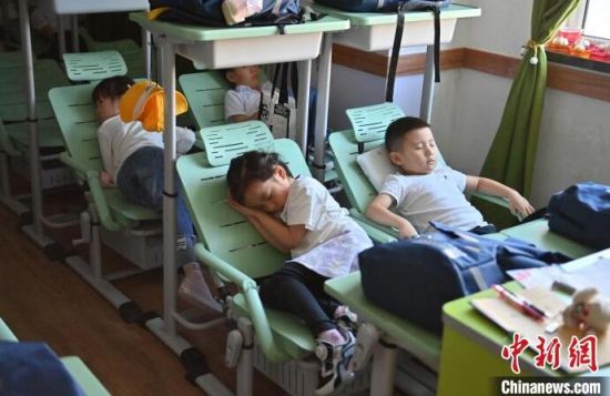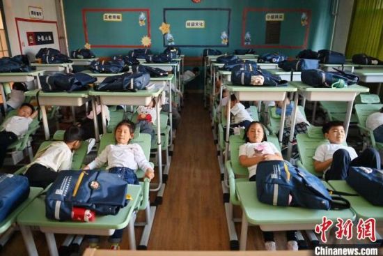 9月5日,在長(zhǎng)春南湖實(shí)驗(yàn)中海小學(xué),學(xué)生們?cè)凇翱商墒健闭n桌椅上午睡。目前,吉林省有多所學(xué)校已啟用“可躺式”課桌椅,學(xué)生們中午可以躺著休息。中新社記者 張瑤 攝