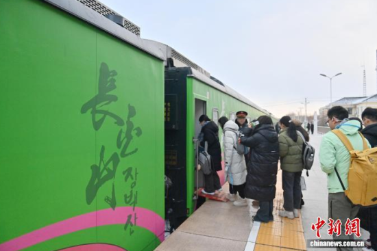 12月3日,直達(dá)長白山的龍井民俗旅游專列鳴笛啟程,開啟冬日樂賞冰雪之旅。該專列融合“冰雪+民俗”雙重主題,每節(jié)車廂各成一道風(fēng)景,絢麗多彩的民俗風(fēng)情貫穿全程。車窗外,壯美的林海雪原不斷掠過,吸引游客觀賞。據(jù)悉,該專列將在每周末往返兩地。中新社記者 張瑤 攝